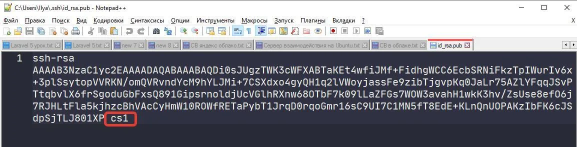 Откроем файл id_rsa.pub в текстовом редакторе. И в самом конце изменим имя пользователя на cs1 .