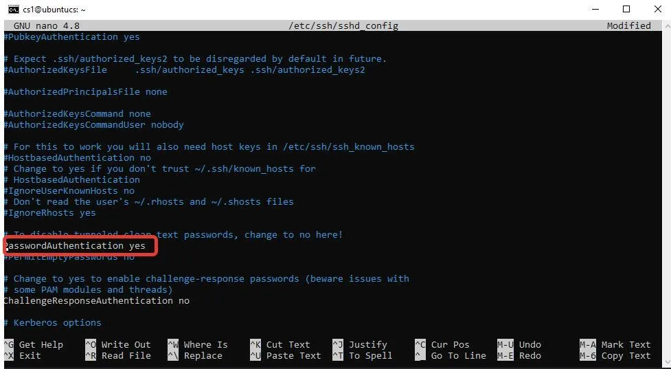 Найдите строку PasswordAuthentication и уберите знак # в начале, если он есть. Заместо no напишите yes