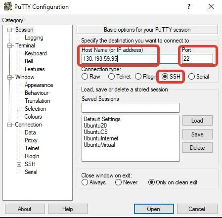 Пробуем подключиться к серверу через putty . Вводим публичный IP адрес, 22 порт, соединение по SSH. Наживаем Open .