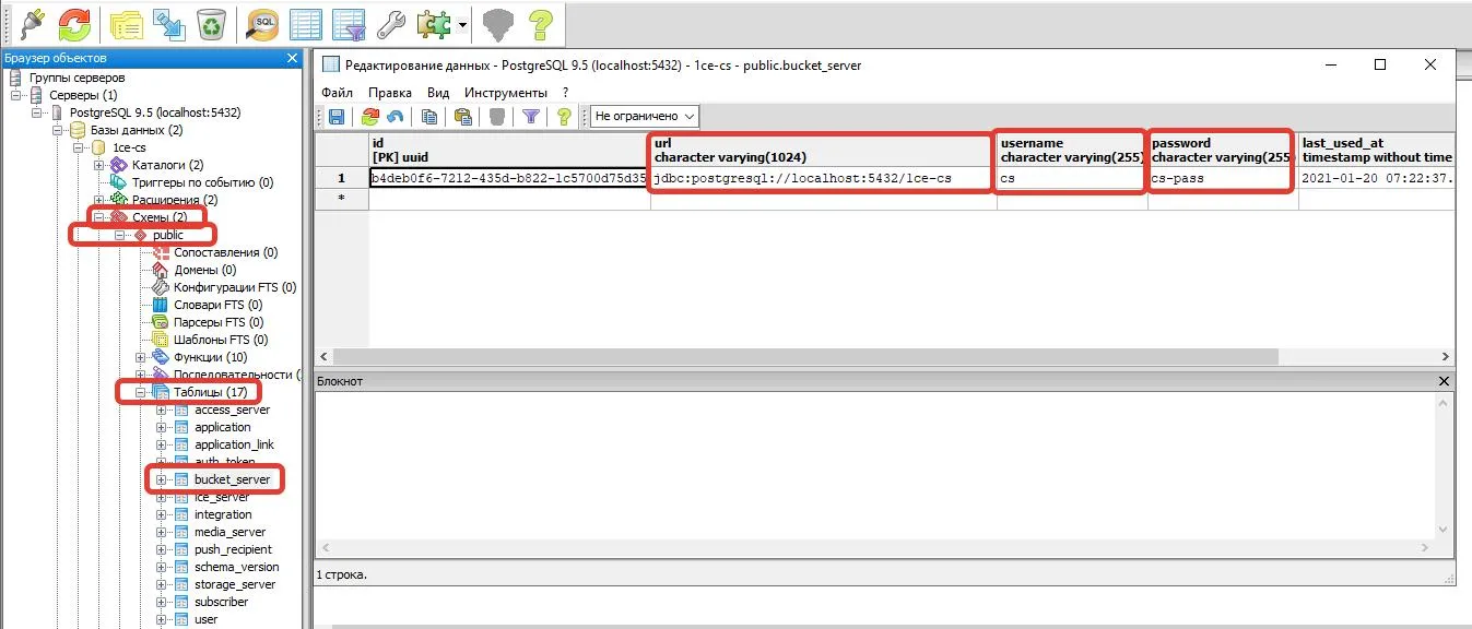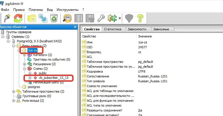 Через pgAdmin создаем базу 1ce-cs , владельцем назначаем пользователя cs .