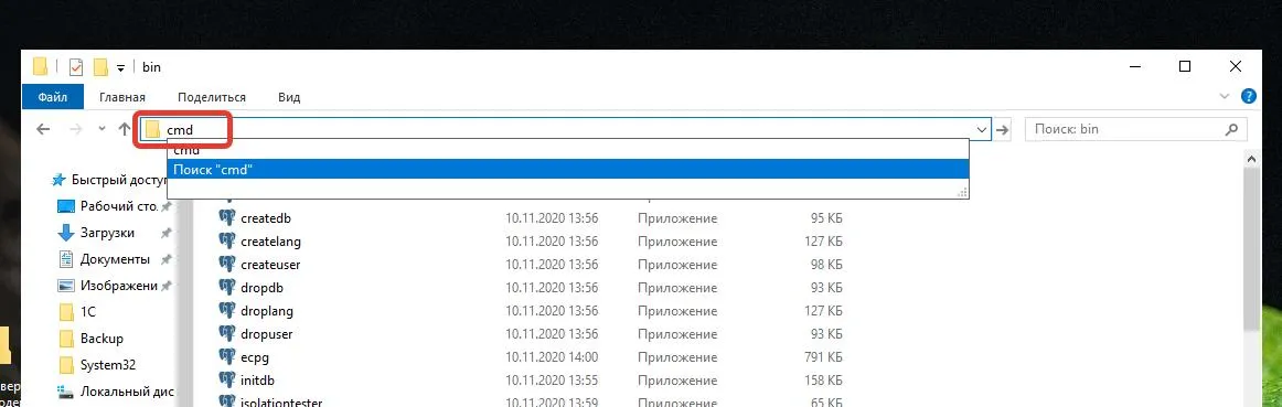 В проводнике переходим в папку где установлен PostgreSQL.